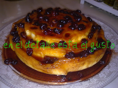 Luego en el fondo del molde pondremos el caramelo liquido, yo en este caso he hecho un poco de almibar (una taza de ázucar con 2 cucharadas de agua a fuego lento sin dejar de remover) al que añadi un par de cucharadas de mermelada de arándanos. Cuando el caramelo ya estaba un poco endurecido he colocado con cuidado la mezcla que hemos preparado, lo metemos en el microondas a maxima potencia en intervalos de 10 minutos en 10 minutos hasta que pasados 30 minutos mas o menos meteremos un palillo y cuando salga limpio ya estara la tarta lista. (os recomiendo que el molde en que lo pongais se quede poco mas de la mitad ya que la tarta en el microondas crece un poco, no valla a ser que se esturree todo)